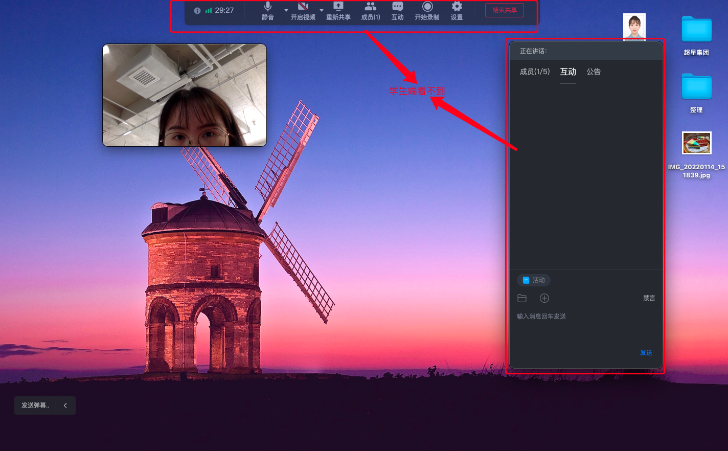 进入泛雅课堂后,若选择共享整个桌面的画面,即上图中的“桌面1”,还可以勾选左下角的【画中画】,可以实现既共享桌面又分享老师端摄像头视频的效果,如下图。同时,老师可任意拖拽摄像头画面以避免遮挡屏幕。